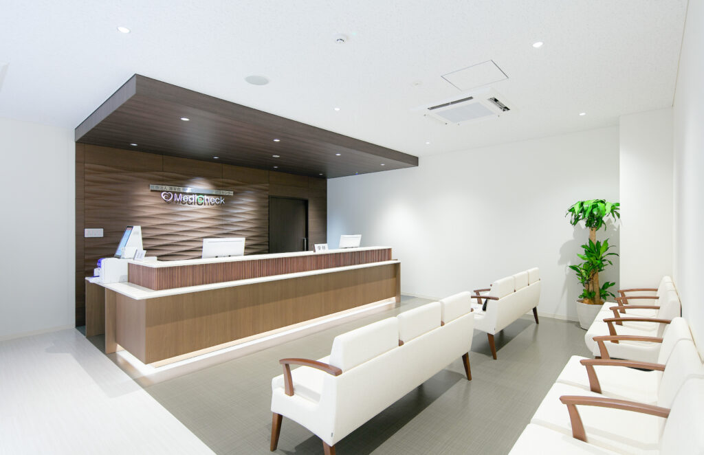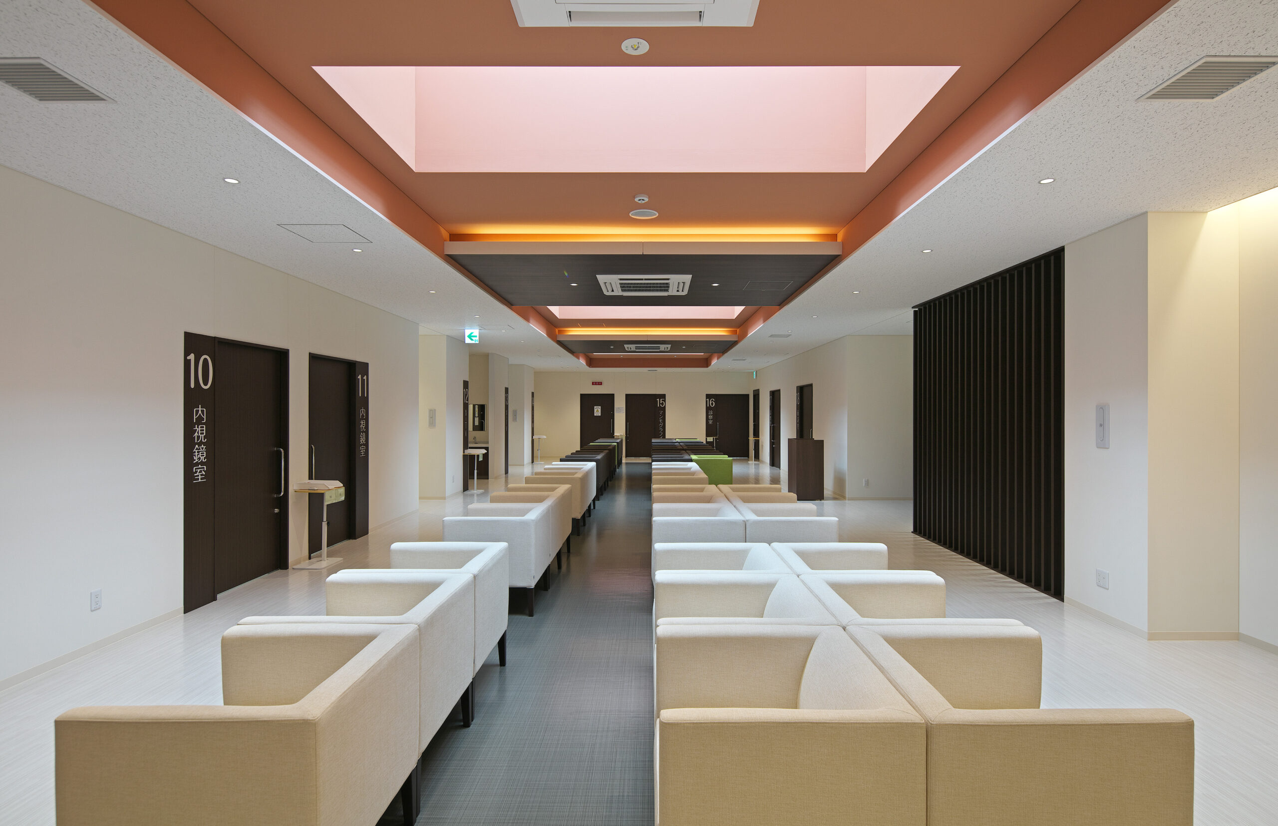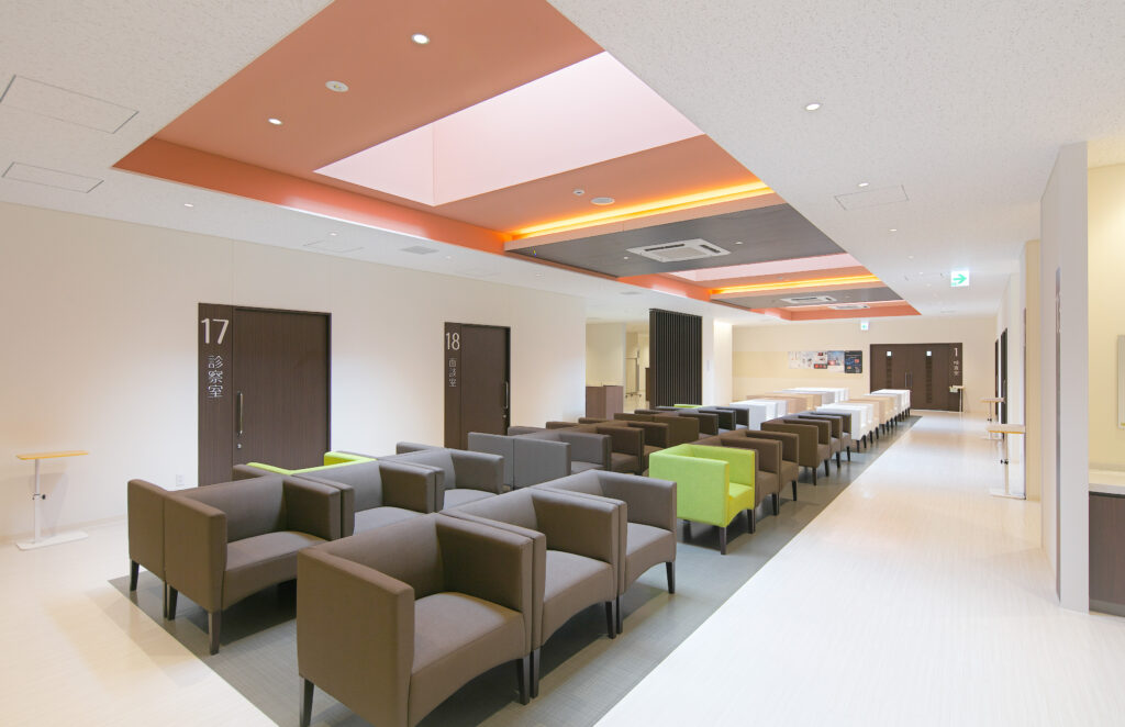 ダークブラウンとアイボリーを基調とし、落ち着いた雰囲気の医療複合施設です。当院の健診センターのほか、他法人様のレディスクリニック、整形外科、皮膚科、調剤薬局が併設されています。
