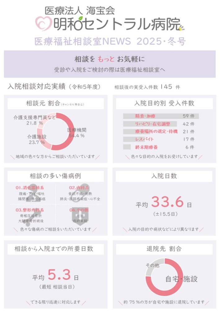 医療福祉相談室は、医療福祉相談と地域医療連携の2つの役目を担っております